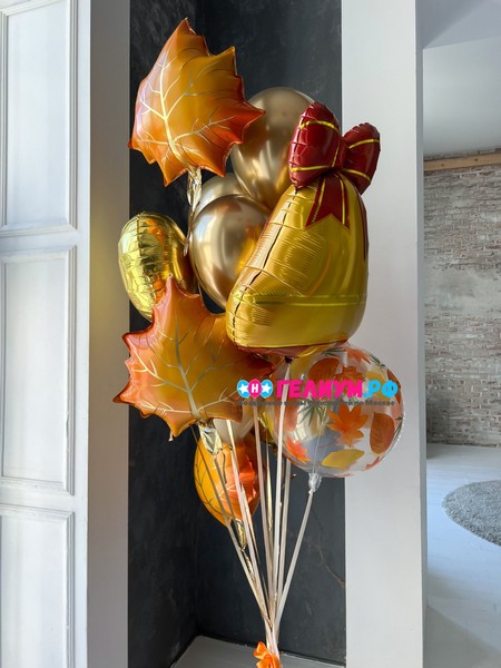 Букет гелиевых шариков с золотым колокольчиком в школу