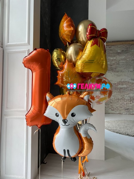 Композиция из шариков на День Знаний с колокольчиком, кленовым листком и лисой
